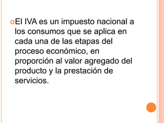 El IVA es un impuesto nacional aplicado a cada etapa del proceso económico en proporción al valor agregado. Aunque inicialmente impopular, tiende a hacerse transparente y garantiza mayor recaudo para el gobierno de manera bimestral. Se aplica a los consumos como un impuesto indirecto, proporcional y regresivo sobre bienes y servicios excluidos tanto para personas naturales como jurídicas responsables del IVA.