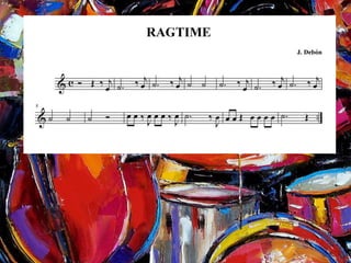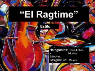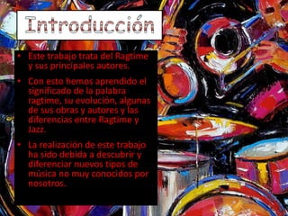 Este documento trata sobre el ragtime y el jazz. Explica que el ragtime es un estilo musical que surgió a finales del siglo XIX caracterizado por su ritmo irregular, mientras que el jazz nació de la mezcla de música europea y afroamericana en Nueva Orleans. También proporciona detalles sobre compositores importantes de ragtime como Scott Joplin y características de este estilo musical como su interpretación principalmente en piano.