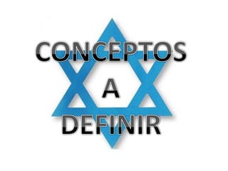 El documento contiene definiciones de varios términos y conceptos relacionados con el judaísmo como festividades como Sucot, Pésaj y Shavuot; símbolos como la Estrella de David y el Menorá; lugares sagrados como el Muro de los Lamentos; y roles religiosos como el Rabino. Explica tradiciones y costumbres asociadas con la religión y cultura judía.