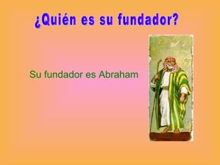 El judaismo fue fundado por Abraham en el 2000 A.C. Se practica principalmente en Israel y donde viven judíos. Crees en un único Dios llamado Yahvé, creador del universo, y en la alianza entre Dios y su pueblo. Los textos sagrados son la Torá y la Biblia hebrea, y su símbolo es la estrella de David.