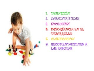 Este documento describe la importancia del juego infantil para el desarrollo del niño. Explica que el juego es la principal forma de aprendizaje en la infancia y favorece el desarrollo físico, cognitivo, social y emocional. Se clasifican los diferentes tipos de juego según la edad del niño, como el juego funcional, simbólico y de reglas. Finalmente, se recomienda a las familias fomentar el juego libre y espontáneo para apoyar el aprendizaje y crecimiento de los