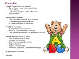 El documento describe la historia y teoría del juego infantil y su importancia en la educación. Cubre cuatro unidades: 1) definición del juego infantil y su metodología, incluyendo teorías como las de Freud, Vygotsky y Piaget; 2) la evolución del juego y su importancia en el desarrollo motor, cognitivo, social y emocional; 3) el modelo lúdico en la nueva escuela basada en el juego; 4) clasificación y planificación de actividades lúdicas. El juego se presenta como fundamental para