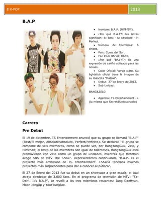 El documento proporciona información sobre tres populares grupos de K-pop: SHINee, B.A.P e Infinite. Resume los orígenes, integrantes, agencias, colores oficiales y fechas de debut de cada grupo. También menciona las subunidades de B.A.P, Infinite H y el debut en solitario de SungKyu de Infinite.