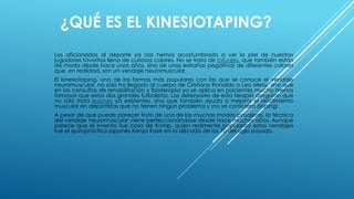 El kinesiotaping es una técnica de vendaje neuromuscular creada por Kenzo Kase en los años 70 que se usa cada vez más en terapia y rehabilitación. Es elástico y permite hasta 140% de elongación, imitando la piel. Sirve para mejorar el movimiento muscular sin restringirlo, reducir inflamación, mejorar circulación, y aliviar dolor muscular y articular.