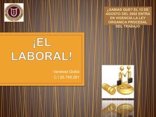 La ley orgánica procesal del trabajo de Venezuela se basa en una serie de principios constitucionales como la jurisdicción laboral autónoma, gratuidad, celeridad, oralidad, prioridad de los hechos y equidad. Establece un proceso laboral uniforme, breve y concentrado con valoración de pruebas y control de legalidad. Los tribunales del trabajo conocen asuntos laborales contenciosos y de amparo laboral en primera y segunda instancia, y la sala de casación social del Tribunal Supremo de Justicia.