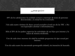 El documento aborda los riesgos asociados al uso de las TIC por adolescentes, destacando que el 60% ha recibido mensajes de desconocidos y que la supervisión parental es escasa. Se menciona el impacto del ciberacoso, el sexting y diversas tácticas de manipulación utilizadas por depredadores en línea. Se proponen recomendaciones para fomentar una utilización más segura de la tecnología, incluyendo la comunicación abierta entre padres e hijos.