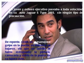 Un ejecutivo se enoja cuando un ladrillo daña su auto, pero luego descubre que un niño lanzó el ladrillo para pedir ayuda porque su hermano en silla de ruedas se cayó y no podía levantarlo. El ejecutivo ayuda al niño a levantar a su hermano, y aprende que a veces Dios usa eventos inesperados para llamar nuestra atención y recordarnos ayudar a otros.