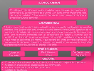 El laudo arbitral es la decisión final del árbitro que resuelve la controversia sometida. Es vinculante y obligatorio como una sentencia judicial. Tiene características como ser la decisión temporal del árbitro sobre los puntos en disputa acordados por las partes. Puede ser total o parcial, definitivo o de derecho o equidad.