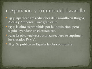 El Lazarillo de Tormes fue publicado por primera vez en 1554 y tuvo gran éxito, aunque fue prohibido por la Inquisición en 1559. Narra la vida de Lázaro, un personaje humilde que sirve a varios amos de diferentes condiciones sociales. A través de esta estructura episódica, la obra inaugura el género de la novela picaresca y presenta una visión crítica de la sociedad renacentista a través del uso del humor y la ironía. El autor permanece anónimo.