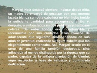 La historia trata sobre Margari Noiz, una mujer que creció en una familia distinguida. De niña siempre llevaba lazos blancos en el pelo que resaltaban su figura. Se enamoró de un hombre que trabajaba en un cañaveral. Una tarde él la llevó a su cabaña y la desnudó dejándole solo el lazo en el pelo. Años después, encontró la playa sembrada de cañas de bambú con lazos blancos, un regalo de amor de su primer amor. Margari se convirtió en