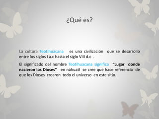 La cultura Teotihuacana se desarrolló entre los siglos I a.C. y VIII d.C. en la Cuenca de México. Construyeron la gran ciudad de Teotihuacán, una de las primeras ciudades metropolitanas de las Américas con una población de 125,000 habitantes. Los teotihuacanos destacaron por su arquitectura monumental como la Pirámide del Sol y de la Luna, su culto a Quetzalcóatl, y su influencia en Mesoamérica a través de la explotación de la ob