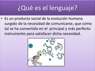 El lenguaje es un producto social surgido de la necesidad humana de comunicarse. Es universal, aprendido y racional, y se compone de unidades significativas (morfemas) y distintivas (fonemas). Tiene funciones representativa, expresiva, apelativa, fática y estética, que permiten informar, expresar emociones, influir en los demás, establecer contacto y utilizar el lenguaje de forma creativa.