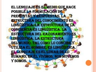 Este documento resume varias teorías sobre la adquisición y desarrollo del lenguaje. Explica que el lenguaje es fundamental para el pensamiento humano según Chomsky. Luego resume las teorías de San Agustín, el conductismo, Chomsky, Vigotsky y Piaget sobre cómo los niños adquieren el lenguaje, ya sea a través de la imitación, la capacidad innata, el desarrollo social o la función simbólica.