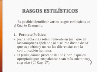 El documento identifica varios rasgos estilísticos del Cuarto Evangelio, incluyendo su formato poético y el uso frecuente de Jesús de lenguaje figurado y metáforas para resolver la situación anómala de transmitir su mensaje sagrado usando lenguaje humano. También señala el uso común de dobles significados en las palabras de Jesús que a menudo conducen a malentendidos o muestran las múltiples facetas de la revelación, así como la presencia de ironía cuando los adversarios de Jesús formulan ju