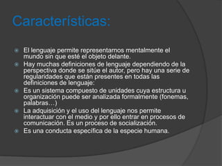 El lenguaje humano permite la comunicación y representación mental del mundo a través de sistemas compuestos de unidades y estructuras como los fonemas y palabras. El lenguaje se adquiere y usa para interactuar socialmente y es una característica única de los seres humanos. Cada lengua tiene sus propias manifestaciones pero comparten regularidades en sus unidades y reglas.
