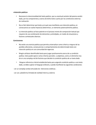 El documento discute la metáfora y lo poético en el lenguaje. Explica que la metáfora opera en múltiples niveles de significado y comparte características con la poesía como el uso de la función estética y elementos estructurales extraordinarios. También analiza las teorías de Jakobson sobre lo poético dominado por la función estética y la intencionalidad requerida. Finalmente, concluye que no hay una definición universal de lo poético y que se debe considerar múltiples factores contextuales para determinar