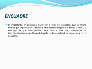 Este documento presenta información sobre diferentes técnicas cinematográficas como el encuadre, formato, escala, ángulos, tipos de planos, movimientos de cámara y el tiempo en el cine. Explica conceptos como picado, contrapicado, traveling, steadicam, y diferentes tipos de objetivos y sus usos. Además, distingue entre el tiempo real y el tiempo fílmico.