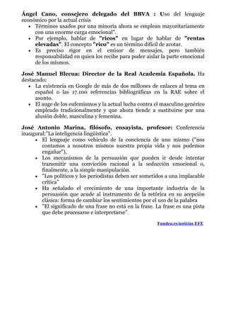 Este documento resume las presentaciones del VI Seminario Internacional de Lengua y Periodismo organizado por Fundéu BBVA y la Fundación San Millán en La Rioja. Los ponentes discutieron el uso del lenguaje políticamente correcto en los medios, el valor de las palabras usadas por políticos y periodistas, y la importancia de un lenguaje riguroso y honesto.
