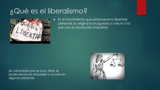 El documento describe el liberalismo como un movimiento que promueve la libertad personal y surgió junto con la revolución industrial para dar poder al pueblo. Se originó debido a que la revolución industrial cambió la forma de pensar de la gente y afectó a México al llegar por la globalización, haciendo que los mexicanos empezaran a buscar su propia libertad.