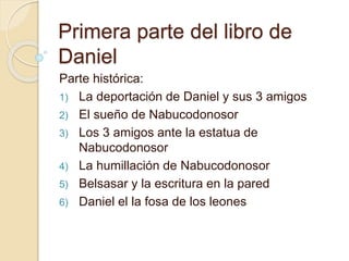 Este documento resume el primer capítulo del libro de Daniel. Presenta una breve introducción histórica sobre la deportación de Daniel y sus amigos a Babilonia por Nabucodonosor. Luego describe cómo Daniel y sus amigos decidieron no contaminarse con la comida del rey para permanecer fieles a Dios, a pesar de las consecuencias. Como resultado, Dios les dio sabiduría y ellos prosperaron.