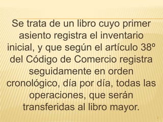 El documento describe el Libro Diario como un registro cronológico de todas las operaciones de una empresa que aplica criterios técnicos para transferir la información al Libro Mayor. Explica que existe un formato para la partida doble en contabilidad completa y otro para la partida simple en contabilidad simplificada, y que el Libro Diario ordena la información por códigos de cuentas y fecha para procesar los saldos.