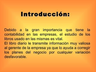 El documento describe el libro diario como un libro principal de uso obligatorio en las empresas para registrar de forma ordenada y cronológica todas las operaciones realizadas. Proporciona información valiosa al gerente sobre la situación financiera de la empresa y ayuda a corregir los planes de negocio ante variaciones. Presenta los débitos y créditos de las transacciones de forma secuencial y con partidas dobles para reflejar el movimiento operacional de la empresa.