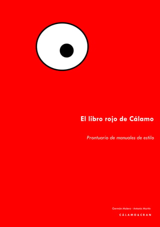 El 'Libro Rojo de Cálamo' es un prontuario de manuales de estilo creado por Germán Molero y Antonio Martín, que busca proporcionar respuestas a las dudas sobre la ortografía y estilo en la lengua española. Esta obra, fruto de un proyecto ambicioso, ofrece herramientas para establecer normas de estilo que aseguren coherencia en los textos, siendo especialmente útil para correctores, editores y escritores. El libro está en constante evolución y se invita a los usuarios a contribuir con comentarios y sugerencias.