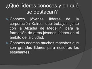 El documento discute los temas de líderes, características de los líderes y la importancia de los líderes. Menciona algunos líderes juveniles de la corporación Kairos y maestros como líderes para los estudiantes. Explica que un líder debe distinguirse por servir en lugar de mandar y guiar a través del trabajo en equipo. Finalmente, el documento incluye varias citas célebres sobre el liderazgo.