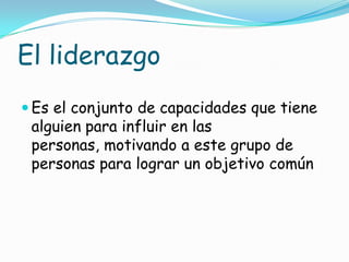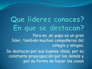 El documento describe las características de un buen líder y la importancia del liderazgo. Un líder debe ser respetado y admirado, crear buenas condiciones para que un grupo avance dando un buen ejemplo, y resolver los problemas de su entorno de la mejor manera posible. Los líderes son importantes porque representan a la sociedad, expresan las opiniones de los demás, y ayudan a lograr objetivos comunes.