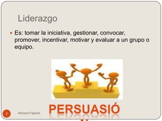 El documento describe diferentes tipos y clasificaciones de liderazgo. Explica que el liderazgo es la capacidad de influir en un grupo para lograr metas y objetivos de manera entusiasta. Luego detalla varias clasificaciones de liderazgo como por su formalidad, relación con los seguidores, tipo de influencia, y más. Finalmente, discute brevemente algunos obstáculos y beneficios del liderazgo.