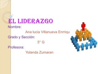 El liderazgo se define como la habilidad de influir en un grupo para lograr metas y objetivos trabajando con entusiasmo. Existen tres tipos de liderazgo: el líder carismático que genera entusiasmo pero depende demasiado de sí mismo, el líder tradicional que hereda el poder, y el líder legítimo que adquiere el poder a través de procedimientos legales.
