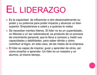 El documento presenta información sobre el liderazgo. Define el liderazgo como la capacidad de influenciar a otros para lograr un bien mayor y empoderar a quienes lo rodean. Explica que existen diferentes tipos de liderazgo como el formal, espontáneo, paternalista y democrático. También destaca la importancia de la motivación para que los equipos sean exitosos, señalando que los líderes deben mantener buenas relaciones e inspirar entusiasmo en el grupo.
