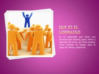 Este documento describe diferentes tipos de liderazgo y características de los líderes. Se mencionan el liderazgo autoritario, democrático y laissez-faire. También se describen cualidades como mantenerse actualizado, comunicarse con los seguidores, tener iniciativa y valentía, y ayudar a crear una realidad emocional positiva para el equipo.