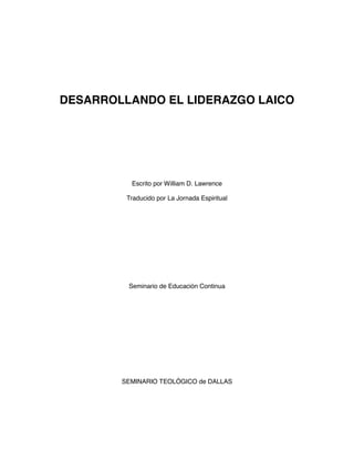 Este documento presenta un seminario de seis sesiones sobre el desarrollo del liderazgo laico. La sesión uno define el liderazgo cristiano como guiar a otros a seguir a Jesucristo mostrándoles el camino. Explora conceptos bíblicos como el liderazgo siendo un don y enfocándose en el cuidado de los demás. También discute que el liderazgo cristiano requiere someterse primero a la autoridad de Cristo y demostrar su seguimiento a través de la vida privada y pública. El objet