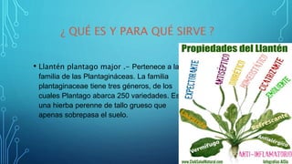 El documento describe el llantén, una hierba medicinal que crece silvestre. Contiene principios activos como flavonoides y taninos que le dan propiedades antiinflamatorias, cicatrizantes y antibacterianas, usadas tradicionalmente para tratar úlceras, infecciones y la tos. Se puede usar externamente en compresas o tomar en infusión, aunque puede causar efectos adversos en algunos grupos como embarazadas o personas con alergias.