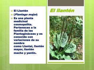 Este documento resume las características y usos medicinales del llantén (Plantago major). Es una planta perenne pequeña con hojas arrosetadas que crecen desde la raíz. Se usa para tratar vaginitis, flujo blanco, leucorrea, heridas, dolor de oídos, resfríos y úlceras. Sus principales virtudes son sus propiedades antiinflamatorias y emolientes.