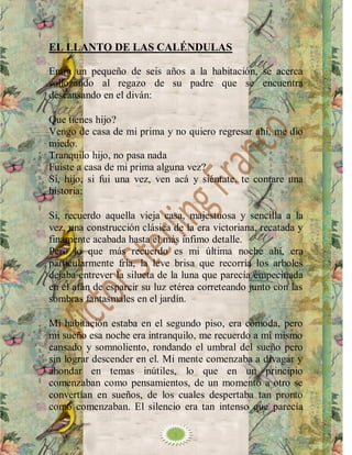Este documento narra la historia de Melina, la hija adoptiva de la tía abuela de un niño. Melina descubre una noche que su mejor amiga Iris y su padre son amantes. Llena de dolor y resentimiento, Melina envenena el té de Iris, matándola. Más tarde, Melina cae en una profunda depresión y muere. Años después, el niño escucha el llanto de las caléndulas en la casa y su tía le cuenta esta trágica historia familiar.