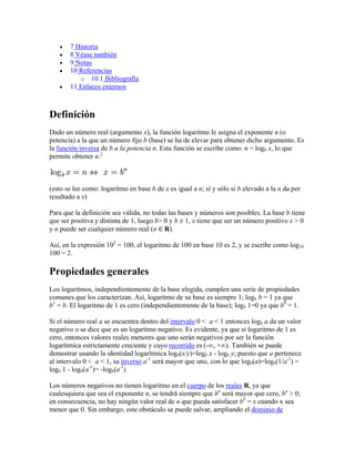 El documento explica los logaritmos, que son la operación inversa a la exponenciación. Los logaritmos de un número representan el exponente al que hay que elevar una base determinada para obtener ese número. Los logaritmos cumplen propiedades como que el logaritmo del producto es la suma de los logaritmos de los factores. También se describen las propiedades analíticas de los logaritmos como funciones y su historia.