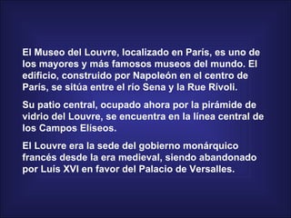 El Museo del Louvre en París es uno de los museos más grandes y famosos del mundo. Fue construido originalmente como un palacio real pero fue abandonado por la monarquía francesa y convertido en museo público durante la Revolución Francesa, albergando ahora obras maestras mundialmente conocidas como la Mona Lisa y la Victoria de Samotracia.