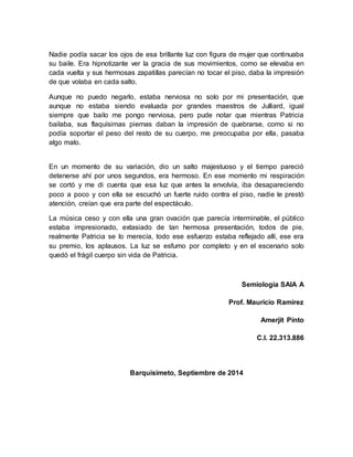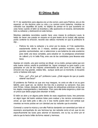 Patricia era una bailarina que se preparaba para una audición importante para obtener una beca en la prestigiosa escuela Julliard. A pesar de sus dudas, se esforzó mucho en los meses previos practicando incansablemente. En la audición, Patricia danzó de forma hermosa y cautivante, pero en un salto colapsó y murió debido a su extrema dedicación que había agotado su cuerpo.