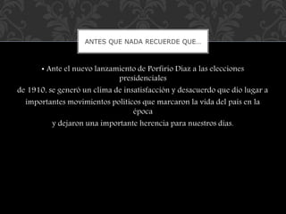 El documento resume el Maderismo en México entre 1910 y 1913. Francisco I. Madero lanzó su candidatura presidencial en 1910 desafiando a Porfirio Díaz, pero fue encarcelado. Madero escapó y expidió el Plan de San Luis llamando a la revolución. Derrotó a Díaz en 1911 forzando su renuncia. Sin embargo, Madero no logró implementar reformas agrarias y enfrentó revueltas como el Plan de Ayala de Emiliano Zapata. Esto llevó a un golpe de estado en febrero