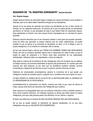 El documento resume la filosofía del maestro Joseph Jacocot sobre la enseñanza. Jacocot creía que todos los seres humanos poseen una inteligencia igual y que los estudiantes pueden aprender por sí mismos sin necesidad de explicaciones del maestro, si se les da la oportunidad y se emancipa su voluntad de aprender. Su método demostró que los estudiantes podían aprender un idioma extranjero simplemente leyendo un libro en ese idioma y su traducción. Esto desafía la creencia de que existen diferentes