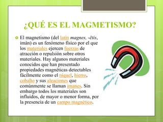 El documento describe el fenómeno del magnetismo. Explica que el magnetismo es producido por campos magnéticos generados por imanes naturales o artificiales, o por corrientes eléctricas. También describe que los materiales magnéticos como el hierro y el níquel contienen dipolos magnéticos a nivel atómico que interactúan con los campos magnéticos externos. Finalmente, explica que la teoría moderna del magnetismo se basa en el movimiento de electrones dentro de los átomos.