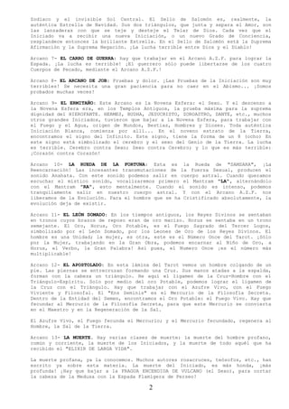 El documento describe los 22 arcanos mayores del Tarot y su relación con la Gran Obra o Magnus Opus, que es la transmutación alquímica de la Luna en Sol. Cada arcano representa un paso en el proceso de transformación espiritual mediante la sublimación de la energía sexual. El objetivo final es encarnar al Hijo del Hombre a través de la simbiosis del Cordero con el Alma.