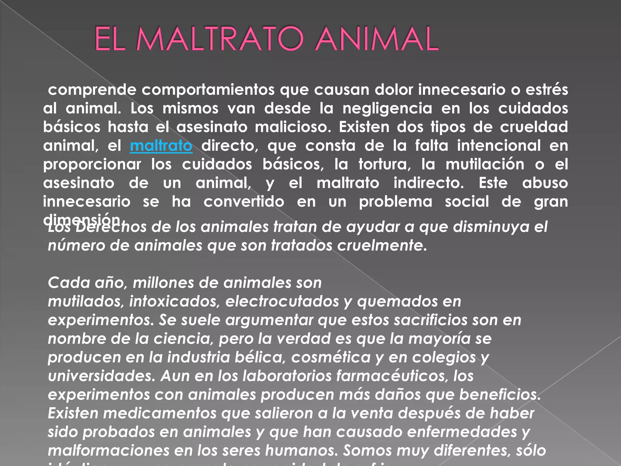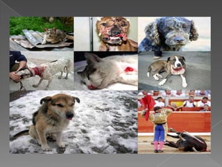 El documento habla sobre la crueldad animal, que incluye comportamientos que causan dolor o estrés innecesario a los animales, desde negligencia hasta asesinato malicioso. Existen dos tipos de crueldad animal: el maltrato directo como falta de cuidados, tortura o asesinato; y el maltrato indirecto. Los derechos de los animales tratan de reducir el número de animales que son tratados cruelmente.