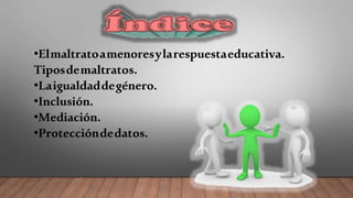 Este documento trata sobre el maltrato infantil y la respuesta educativa. Define el maltrato infantil y los diferentes tipos como físico, por negligencia, psicológico, sexual, institucional y de explotación. También cubre el acoso escolar, ciberacoso y la prevención a través de la igualdad de género e inclusión. Explica el papel de los centros educativos en la detección, prevención y protocolos de actuación, así como la protección de datos personales del alumnado.
