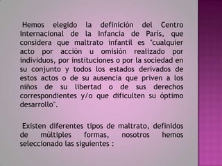 El documento define el maltrato infantil como cualquier acto u omisión que prive a los niños de sus derechos o dificulte su desarrollo óptimo. Describe diferentes tipos de maltrato como físico, sexual, emocional y abandono. También identifica factores de riesgo como problemas de comportamiento del niño, estrés familiar, consumo de drogas de los padres, e historias de maltrato en la familia. Finalmente, explica que el maltrato puede tener consecuencias físicas, psicológicas y sociales para el desar