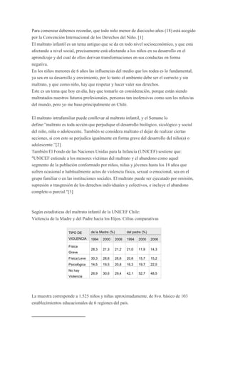 El documento describe los diferentes tipos de maltrato infantil, incluyendo el maltrato físico, psicológico, sexual, abandono físico y emocional, y niños testigos de violencia doméstica. Explica que el maltrato infantil afecta a la sociedad y ocurre en todos los estratos socioeconómicos. Además, presenta estadísticas de la UNICEF sobre los niveles de violencia de los padres hacia los hijos en Chile y cómo estos niveles no han disminuido significativamente a través de los