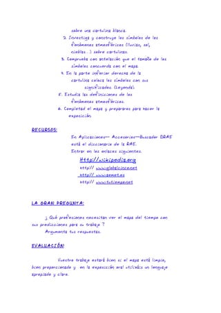 Este documento presenta una unidad sobre la elaboración de mapas del tiempo. Los estudiantes aprenderán a interpretar y crear mapas meteorológicos de España. Trabajarán en equipos para dibujar un mapa de España, investigar símbolos de fenómenos atmosféricos, completar el mapa con una predicción y presentarlo ante la clase.