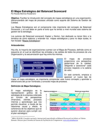El documento presenta el concepto de mapas estratégicos dentro del framework del balanced scorecard, destacando su importancia para visualizar la estrategia de una organización y diferenciarlo del mapa de procesos. Se describen los elementos clave de un mapa estratégico, que incluye perspectivas, objetivos y relaciones causa-efecto, y se enumeran sus beneficios, como mejorar la comunicación y detectar inconsistencias en los objetivos. Finalmente, se concluye enfatizando la necesidad de no confundir ambos tipos de mapas, ya que son complementarios en la gestión de calidad y estrategia.